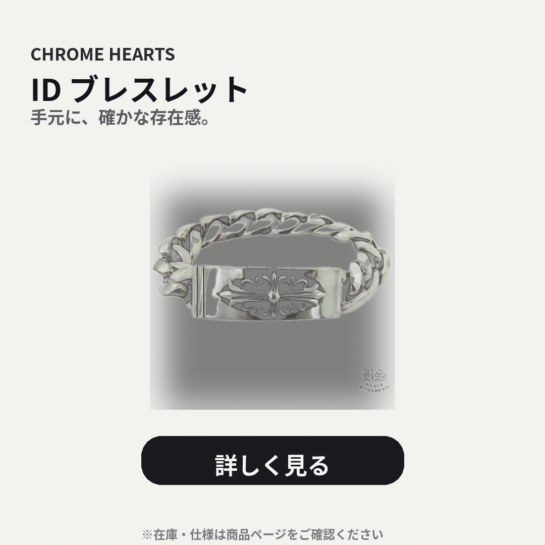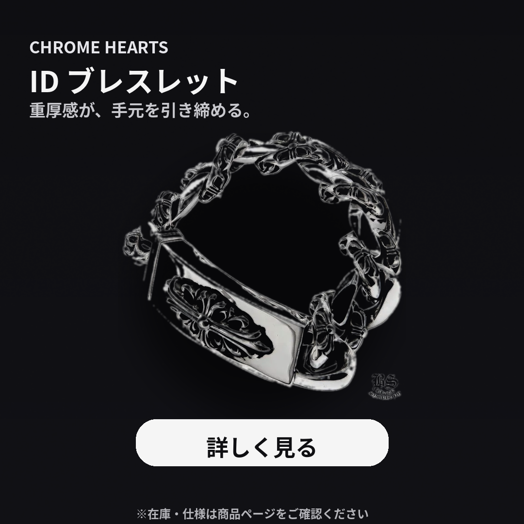 クロムハーツのIDブレスレット。重厚なチェーンと立体的な彫り込みが、手元を一瞬で引き締める。派手じゃないのに、視線は奪う——“格”を上げたい日に選ぶ一本。