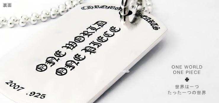 プレート表面のシルバーの滑らかさと、刻まれたフレアニーのラインのコントラストが実に美しいクロムハーツのドッグタグ(ネックレス)です。裏面には「ONE WORLD ONE PIECE」というメッセージ性の強い文字が刻まれており、従来のクロムハーツアイテムとは少し雰囲気の違うドッグタグです。