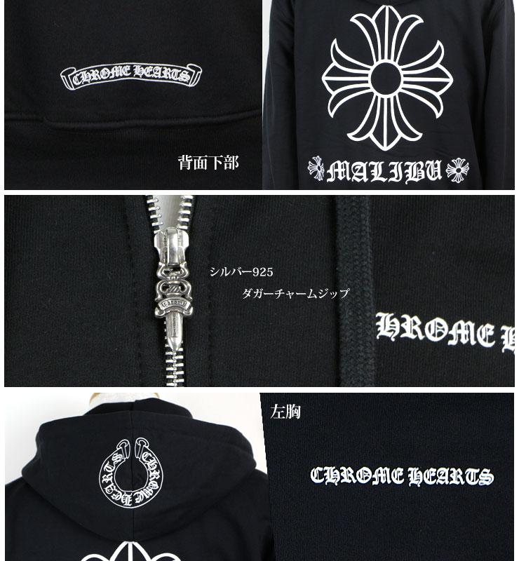 クロムハーツマリブ店限定パーカーが入荷!正面の左胸には「CHROMEHEARTS」のロゴと裾にCHイニシャルと比較的正面はシンプルなデザインですが、 ジッパーの引き手をシルバー素材のダガーチャームで作り、背面にはクロムハーツのモチーフであるCHプラス、下部にマリブ限定の証である クロムハーツ書体で書かれた文字が大きくプリントされています。また、フードにクロムハーツのロゴであるホースシュー入れ、バランスよくデザインされた パーカーです。中の生地も肌触りがよくとても着心地が良いアイテムです。