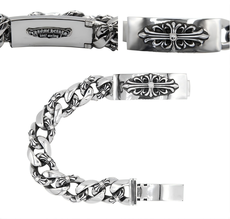 CHROME HEARTS(クロムハーツ)フローラルクロス IDブレスレット。 925シルバーの重厚感・チェーンの立体感(記載)・レザー×シルバー(記載)で手元に存在感。