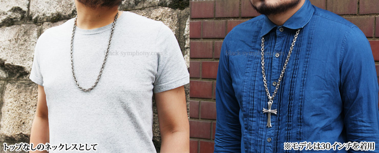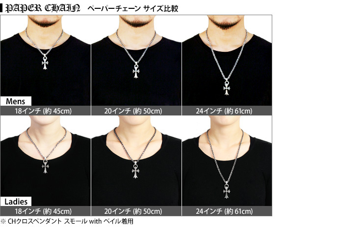 女性ならば少し長めにゆったりと身につけられる長さで、ラージペーパーチェーンをネックレスとして使用するには使い易いサイズ。