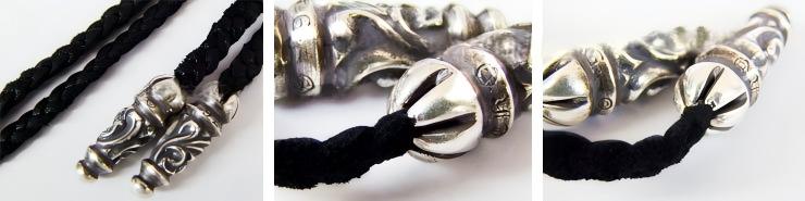 クロムハーツの上質な革を丁寧に編みこまれた先端に、ボロチップがついた革紐のネックレスです。