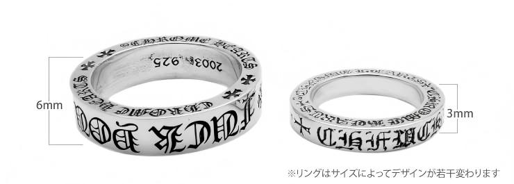 厚さ3mmという極小さなスペースに刻み燻された【CHROME HEARTS】の文字と、CHクロスモチーフが印象的なデザインのリングとなっております。ハードな文字が刻まれているため、クロムハーツらしいデザインの指輪が欲しい方にもオススメです。