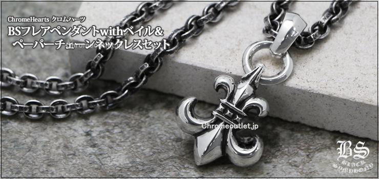 クロムハーツで不動の人気を誇るペーパーチェーンネックレスのペンダントトップにBSフレアペンダントwithベイルを当店オリジナルのセットにしたのが今商品「BSフレアペンダントwithベイル&ペーパーチェーンネックレスセット」です。