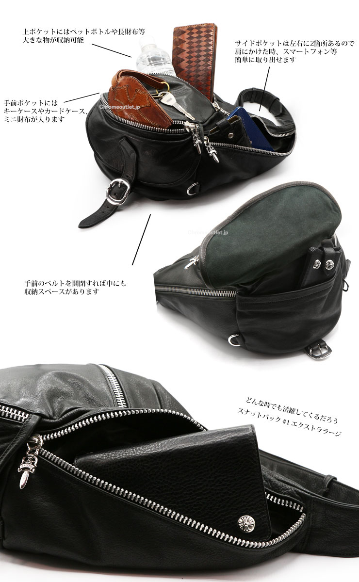 エクストララージサイズはクロムハーツのスナットパック#1のサイズ展開の中でも一番大きいサイズ感で、ファッション性だけではなく収納力の高さにもこだわりぬいたボディバッグです。