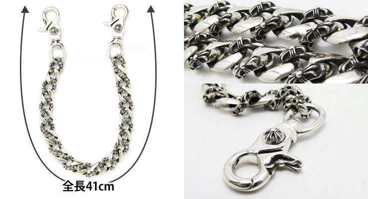 プレーンなチェーンと、細やかな技工が光る小さなクロスが模られたチェーンとが交互に交差するファンシーチェーンを採用した比較的レアで、ラグジュアリー感の強いウォレットチェーン。