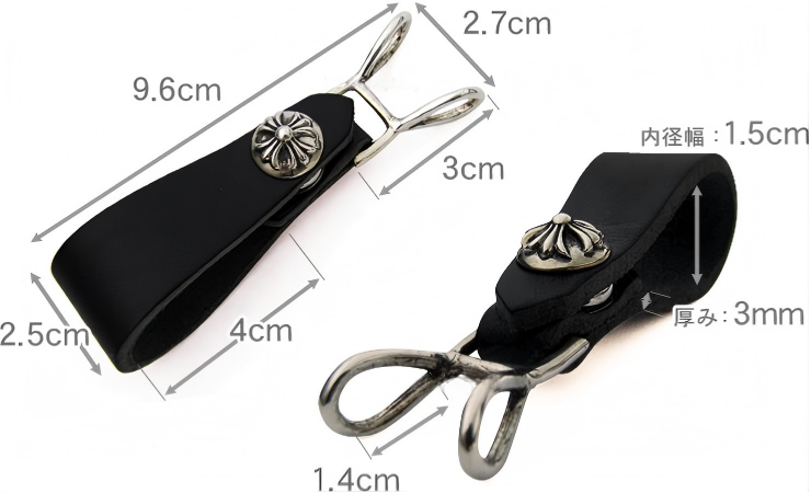 「Wベルトループ クロスボタン ブラック レザー」は名前の通り、4.5cm幅以下のベルトに通してご利用いただく商品で、ウォレットチェーンをつけたり、キーチェーンなどのアイテムをつけることができ、実用性に富んだ一品です。