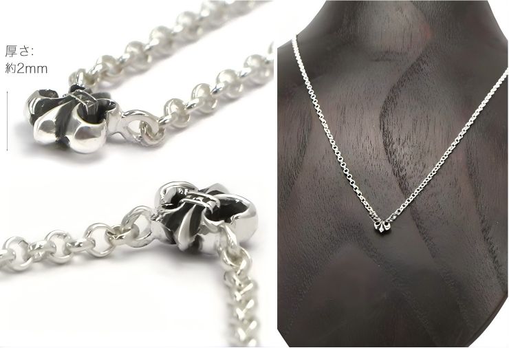 当店で扱うフレアモチーフのネックレスチェーンの中では最も小さく、男女問わず身に着けられるので、恋人への贈り物としてもピッタリですし、大きくゴテゴテしたデザインが苦手な方にもオススメです。特筆すべきはチャームの接合部分。接合部分が通常の丸カンではなく、チェーンに直接固定されているので、留め具が前にくる心配はありません。スポーツや仕事の最中も邪魔になることもなくオシャレを楽しむことができます。